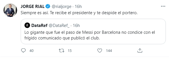 En su cuenta oficial de Twitter escribió: "Siempre es así. Te recibe el presidente y te despide el portero", comparando así su salida del canal con el que trabajó dos décadas, con la del jugador, utilizando la frase la misma frase con la que describió su salida en aquella oportunidad.