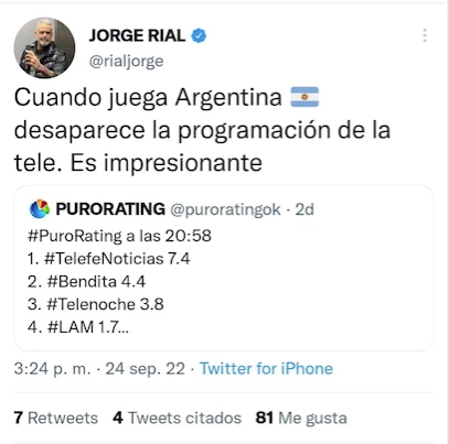 Siempre rápido para los mandados que dejan mal parado a América, su ex canal, Rial -quien emitió una polémica opinión tras la muerte de Carlitos Balá- publicó un tuit que evidenció esa situación. Además de subir los rating de ese momento, escribió, filoso: "Cuando juega Argentina desaparece la programación de la tele. Es impresionante". En ese momento, según lo que mostró el periodista, LAM ocupaba el último lugar "de la tabla" con apenas 1.7 puntos, muy por debajo de los 3.8 de Telenoche, los 4.4 de Bendita y los 7.4 de Telefe Noticias.