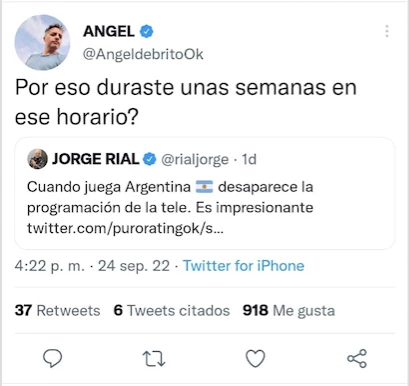Atento a todo lo que se dice de su programa, y respondón cuando le sale del alma defenderlo, Angel de Brito cruzó a Rial. Primero de manera directa, y después interactuando con otros usuarios que le acercaron comentarios. El conductor de LAM "citó" el tuit de JR y a su lapidario "desaparece la programación de la tele" le contestó con un fuerte y doloroso recuerdo: "¿Por eso duraste unas semanas en ese horario?", en referencia a la última aventura de Rial en la televisión abierta: TV Nostra fue un rotundo fracaso de audiencia y apenas estuvo 47 noches al aire.