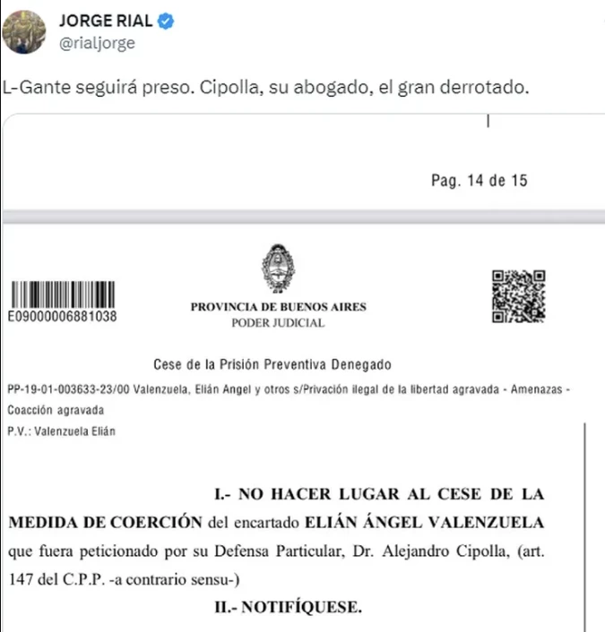 Y aprovechando un revés jurídico que tuvo Cipolla en las últimas horas donde se conoció que el juez le negó a L- Gante, otro de sus representados, el Cese de la Prisión Preventiva, es que publicó el escrito bajo una significativa leyenda. "L-Gante seguirá preso. Cipolla, su abogado, el gran derrotado".