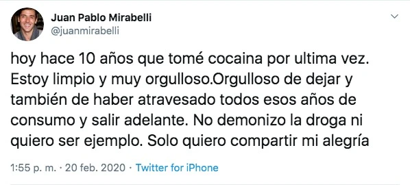 Tan frontal, directo y transgresor arriba de los escenarios, donde interpreta los más variados y provocadores personajes, como cuando apoya sus dedos al teclado y escribe en sus redes sociales, el actor Juan Pablo Mirabelli aprovechó su cuenta de Twitter para celebrar que “hace 10 años que no tomo cocaína”.