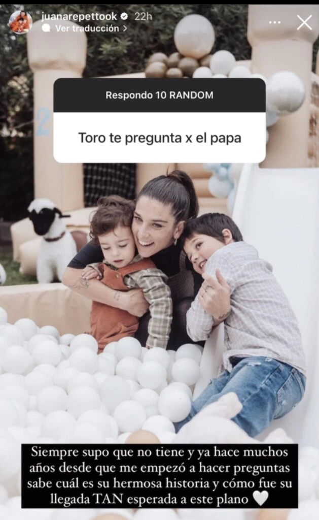 “¿Toro te pregunta por el papá?”, redactó un usuario de la aplicación. A lo que Juana, sobre una foto jugando con sus varoncitos, escribió: “Siempre supo que no tiene, y ya hace muchos años desde que me empezó a hacer preguntas. Sabe su hermosa historia y cómo fue su llegada tan esperada a este plano”.