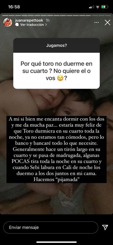 Fue entonces que otra persona le preguntó a la actriz “¿Por qué Toro no duerme en su cuarto?, ¿No quiere él o no querés vos?”. Por su parte, Juana detalló: “A mí si bien me encanta dormir con los dos y me da mucha paz… estaría muy feliz de que Toro durmiera en su cuarto toda la noche, ya no estamos tan cómodos, pero lo banco y bancaré todo lo que necesite”.