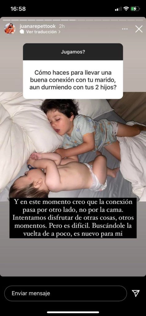 “¿Cómo hacés para llevar una buena conexión con tu marido aún durmiendo con tus dos hijos?”, le consultó un usuario de instagram. A lo que Juana no tuvo problema en hablar sobre esa parte de su relación con Sebastián Graviotto y le comentó: “En este momento creo que la conexión pasa por otro lado, no por la cama”.