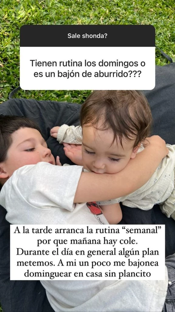 "A la tarde arranca la rutina semanal porque mañana hay cole. Durante el día en general algún plan metemos. A mi un poco me bajonea dominguear un poco sin pancito", compartió Repetto, que ya se convirtió en una experta mamá x 2.