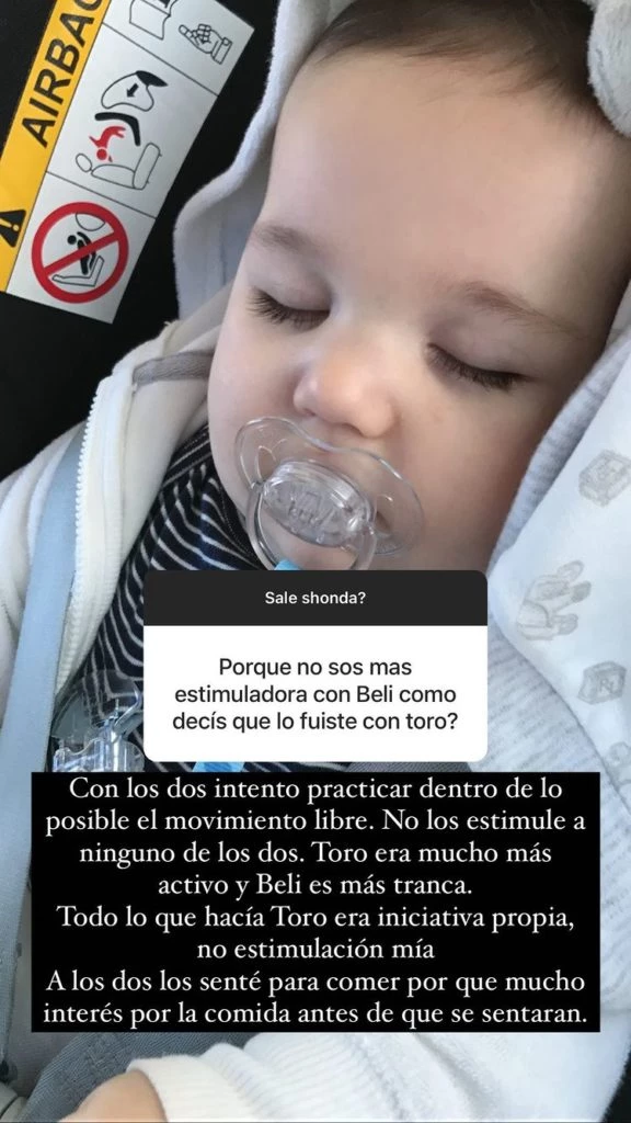 "¿Por qué no sos más estimuladora con Beli como lo fuiste con Toro?", le plantearon a Juana. "Con los dos intento practicar dentro de lo posible el movimiento libre. No los estimulé a ninguno de los dos. Toro era mucho más activo y Beli es más tranca", argumentó Repetto, quien bajó 17 kilos luego de la llegada de su segundo heredero.