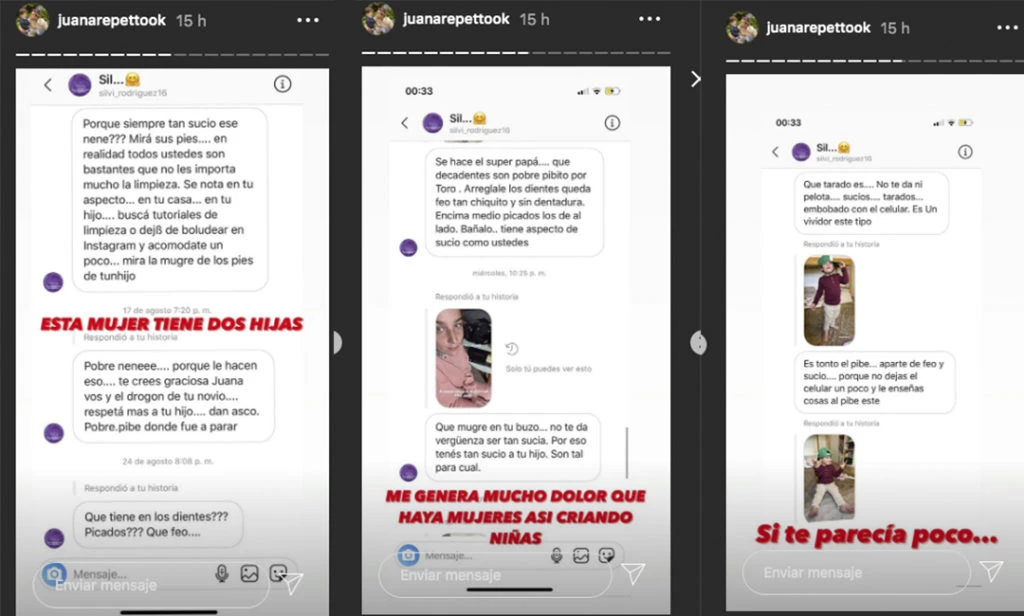 Juanita decidió tomar el toro por las astas y no quedarse de brazos cruzados, por eso fue subiendo las capturas de todo esto que escribió la señora. Además exteriorizó: "Me genera mucho dolor que haya mujeres así criando niñas… Esta mujer tiene dos hijas".