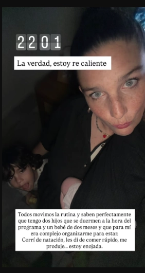 A través de su Instagram narró con lujo de detalles: “Hice un esfuerzo para estar. A las 20:00 llegaba el móvil a casa y el programa termina a las 22:00, que es la hora en la que mis hijos se duermen, y tengo un bebé de dos meses”. Así como valoró al conductor: “La hice porque a Ángel lo quiero, me respetó siempre mis embarazos. Es un programa que quiero desde hace mucho tiempo”.