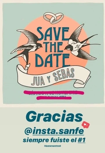 En esta oportunidad, Juana mostró la tarjeta de casamiento que envió a sus invitados. "Save the date. Jua y Sebas", reza el texto de la imagen junto al dibujo de dos aves y anillos entrelazados.