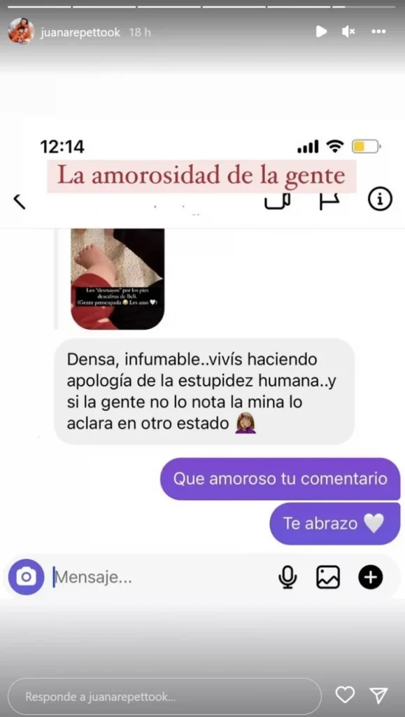 Por eso, Juanita decidió deschavar a una follower que le acercó un comentario muy doloroso, sin lógica, en el que le dedicó palabras horrendas e inentendibles. En una maniobra inteligente para concientizar de la falta de empatía de muchos internautas.