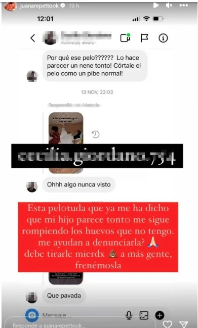 Movilizada por la indignación, Repetto compartió la captura de ese chat y exclamó: "Esta pelotud... que ya me ha dicho que mi hijo parece tonto me sigue rompiendo los huevos que no tengo. ¿Me ayudan a denunciarla? Debe tirarle mierd... a más gente, hay que frenarla".