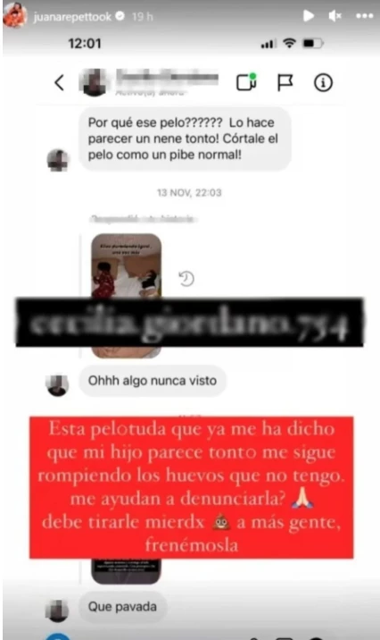 "Esta pelo… que ya me ha dicho que mi hijo parece un tonto, me sigue rompiendo los huevos que no tengo, me ayudan a denunciarla?. Debe tirarle mierdx a más gente, frenémosla", describió Juana. Enfrentando una vez más el ojo juzgador de las personas, la joven artista salió a defender a su familia.