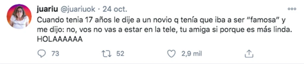 “Cuando tenía 17 años le dije a un novio que tenía que iba a ser ‘famosa’ y me dijo: ‘No, vos no vas a estar en la tele, tu amiga sí porque es más linda’. HOLAAAAAA”, escribió en su cuenta de Twitter logrando una infinidad de comentarios.