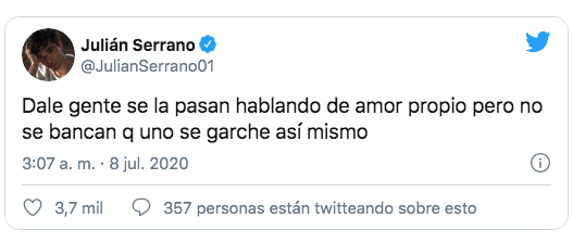 Poco después el escrache se trasladó a Twitter y el actor decidió salir a defenderse. “Dale gente, se la pasan hablando de amor propio pero no se bancan que uno se garche a sí mismo”, argumentó Serrano.