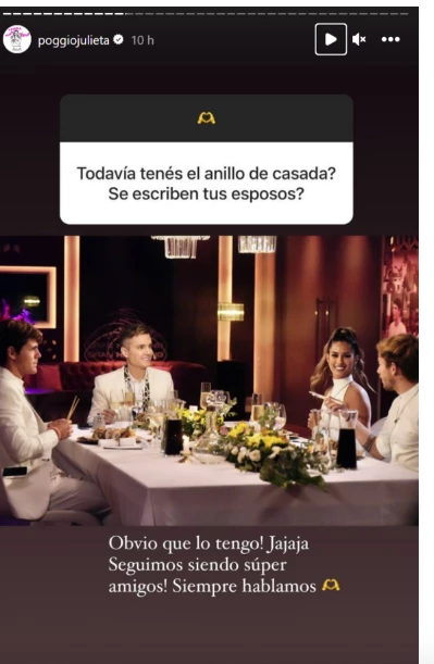 En esa dinámica de abrir las preguntas para los followers, la bailarina se encontró con una consulta en esa dirección, dado que una seguidora le escribió: “¿Todavía tenés el anillo de casada? ¿Te escriben tus esposos?”. En referencia a esa boda ficticia celebrada en las horas previas a la final de Gran Hermano.
