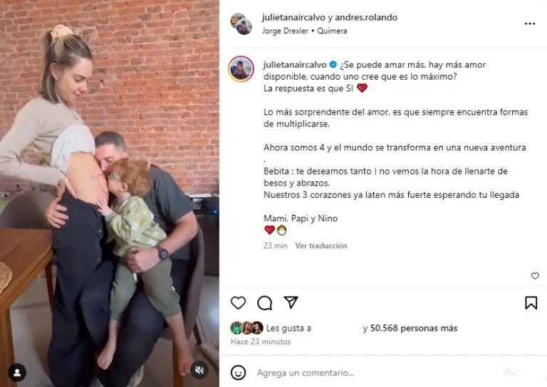 Habiendo mantenido en secreto el embarazo por el tiempo prudencial que se acostumbra y aconseja, Julieta subió el viernes 9 de agosto a su perfil, arrobando a su compañero, un reel con tiernas imágenes de su hijo y su marido besando la pancita que llevaba la ilustración de un corazón.