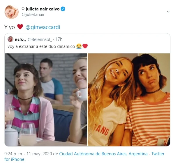 Por último, la actriz compatió el mensaje de una de sus admiradoras que tenía una foto de su personaje junto al de Gimena Acardi. "Voy a extrañar a este dúo dinámico", escribió la seguidora y ella agregó: "Y yo @gimeaccardi".