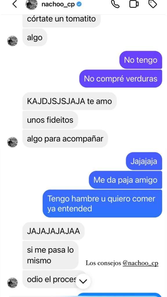 “Ahora la bajé, me la voy a comer quemada igual”, cerró Juli, entre risas, generando todo tipo de reacciones entre sus seguidores, como Nacho Castañares, que le sugirió que le sumara “un tomatito” al menú. “No tengo, no compré verdura”, contestó ella, justificando así su desidia: “Me da paja, tengo hambre”.