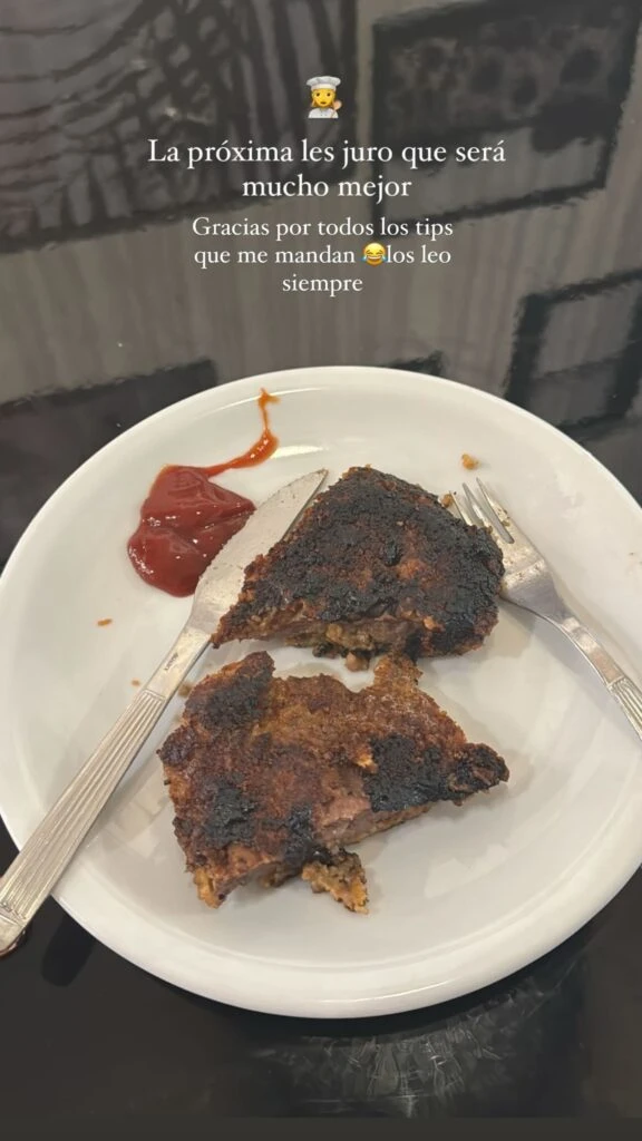 “Actualización, día tres viviendo sola. Me pedí una milanesa por delivery y la puse en la sartén. Como soy una ansiosa, puse el fuego al mango. Y está crudísima por adentro y quemada por afuera…”, contó la actriz, mientras enfocaba el resultado desastroso.