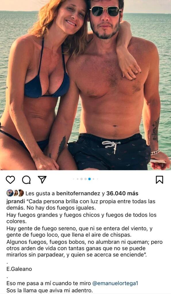 “Algunos fuegos, fuegos bobos, no alumbran ni queman; pero otros arden de vida con tantas ganas que no se puede mirarlos sin parpadear, y quien se acerca se enciende. Eso me pasa a mí cuando te miro @emanuelortega1. Sos la llama que aviva mi adentro”, cerró Prandi parafraseando al legendario escritor uruguayo Eduardo Galeano.