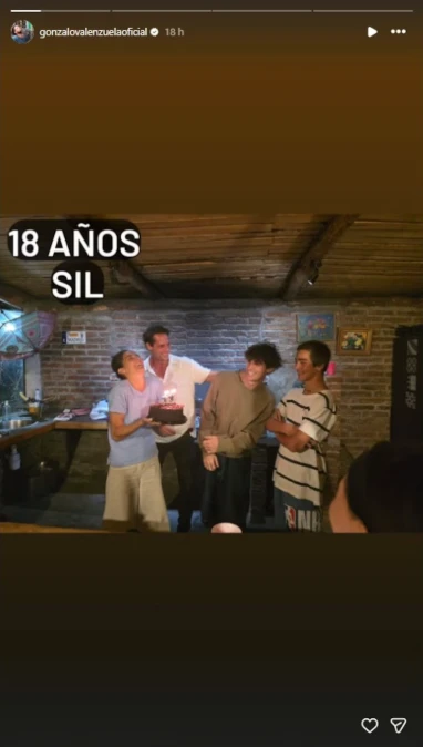 En la foto aparecen Gonzalo, Juana -con la torta en la mano-, Silvestre y Alí La postal habla por sí sola y el chileno compartió su emoción por el cumpleaños de su hijo: “18 años, Sil”. Fue un momento importante pero a la vez más que necesario para el chileno, que viene de atravesar una lamentable separación de su esposa hace apenas unos días. Y su refugio, como siempre, es su familia.