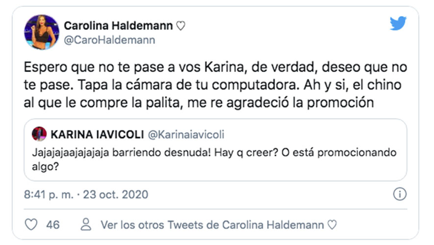 Eso ocurrió cuando Karina Iavícoli, panelista del programa Los Ángeles de la mañana twiteó: "Jajajajaajajajaja barriendo desnuda! ¿Hay que creer? ¿O está promocionando algo?"