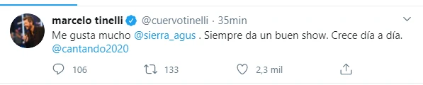 "Me gusta mucho Agustín Sierra. Siempre da un buen show. Crece día a día", escribió el conductor en sus redes sociales y lo leyeron al aire del Cantando.