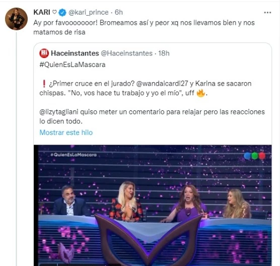 Todo se dio cuando los jurados intentaban adivinar al participante debajo de la máscara. Fue entonces que la esposa de Mauro Icardi le consultó a su compañera: "Kari estoy dudosa de ¿si es hombre o mujer esa voz?". A lo que Karina respondió: "No, vos hacé tu trabajo y yo el mío".