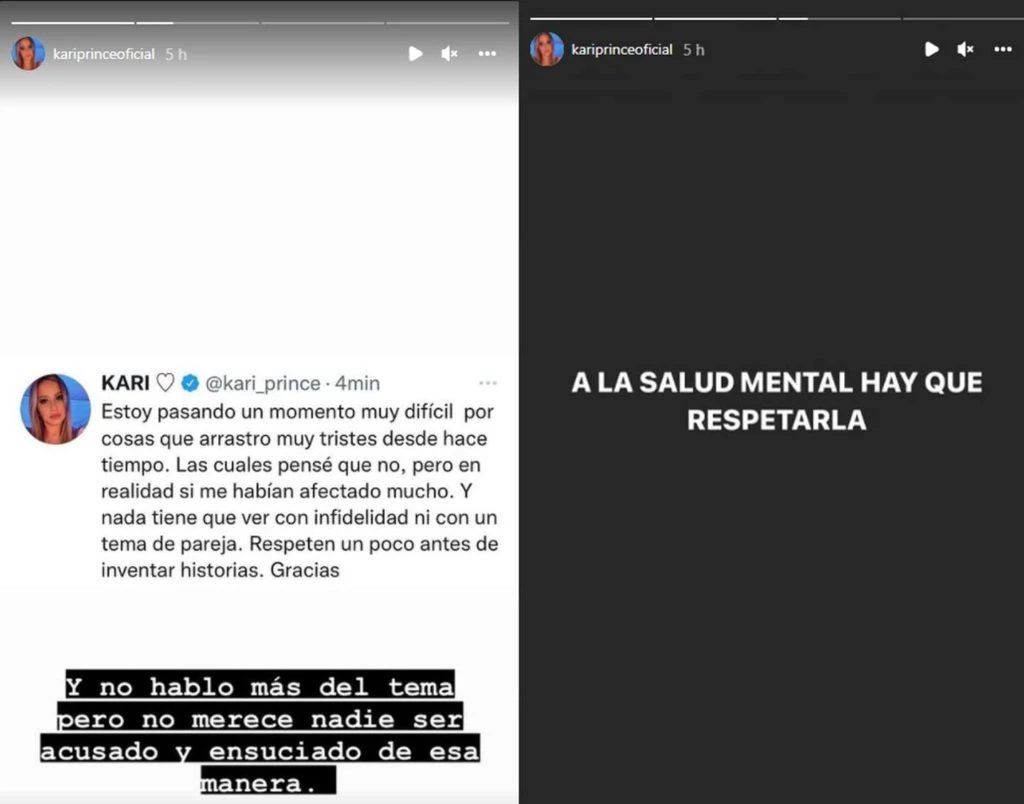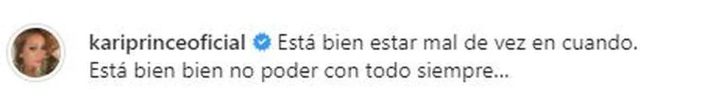 “Estoy pasando un momento muy difícil por cosas que arrastro muy tristes desde hace tiempo. Las cuales pensé que no, pero en realidad sí me habían afectado mucho”, escribió Karina en las stories. Además, aclaró que su malestar no se produce por problemas del corazón: “Y nada tiene que ver con infidelidad ni con un tema de pareja. Respeten un poco antes de inventar historias. Gracias”.