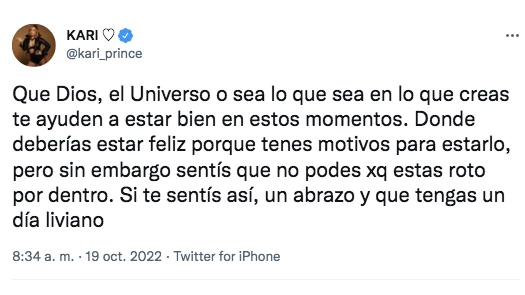 A pesar de estos rasgos manifiestos por la propia cantante, llamó la atención un posteo que compartió en su perfil oficial de Twitter. Unas líneas que refieren a unas vibraciones que laten en su interior que distan de la alegría, la luminosidad y que activaron las alarmas de la preocupación por Karina.