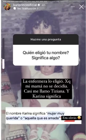 El ida y vuelva comenzó cuando una fan de Instagram le preguntó cuál era el origen de su nombre.“La enfermera lo eligió. Porque mi mamá no se decidía. Casi me llamo Tiziana”, aseguró. El nombre Karina significa ‘mujer muy querida o aquella que es amada’… Era obvio”, señaló.