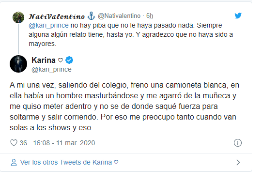 “A mí una vez, saliendo del colegio, frenó una camioneta blanca. En ella había un hombre masturbándose y me agarró de la muñeca y me quiso meter adentro y no sé de dónde saqué fuerzas para soltarme y salir corriendo”, escribió Karina, movilizada por el mensaje de una fans, que dijo que "no hay una piba que no le haya pasado nada".