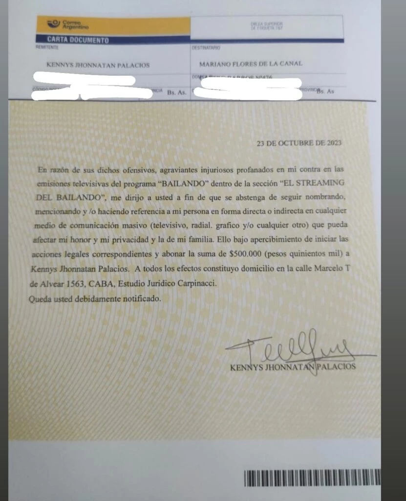 "Ello bajo apercibimiento de iniciar las acciones legales correspondientes y abonar la suma de $500.000 (pesos quinientos mil) a Kennys Jonnathan Palacios. A todos los efectos constituyo domicilio en la calle Marcelo T de Alvear 1563, CABA, Estudio Jurídico Carpinacci", sumó.