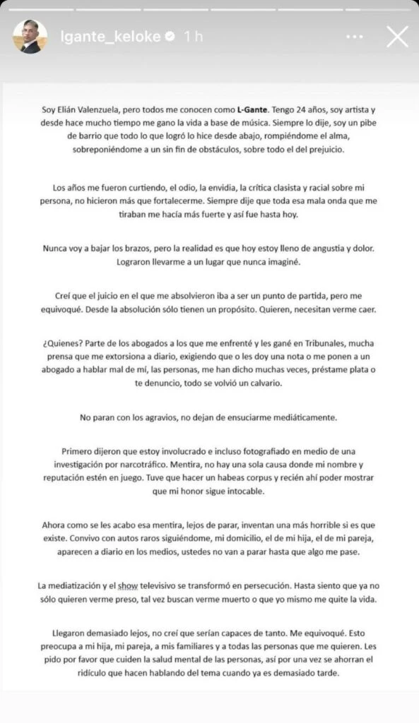 "Soy Elián Valenzuela, pero todos me conocen como L-Gante. Tengo 24 años, soy artista y desde hace mucho tiempo me gano la vida a base de música. Siempre lo dije, soy un pibe de barrio que todo lo que logró lo hice desde abajo, rompiéndome el alma, sobreponiéndome a un sin fin de obstáculos, sobre todo el del prejuicio", comenzó.