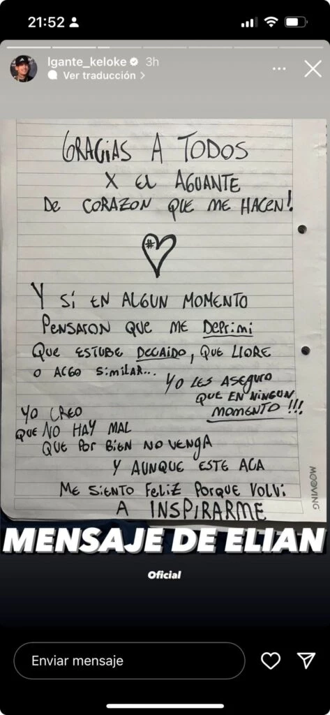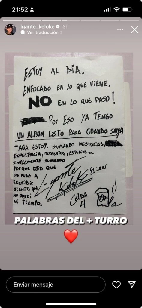 “No hay mal que por bien no venga y aunque esté acá, estoy feliz porque volví a inspirarme. Estoy al día. Enfocado en lo que viene. ¡No en lo que pasó! Por eso ya tengo un álbum listo para cuando salga. Acá estoy, sumando historias, experiencias, momentos, estudios… Simplemente sumando porque ojo que me puse a escribir, siento que no perdí mi tiempo”, redactó L-Gante.