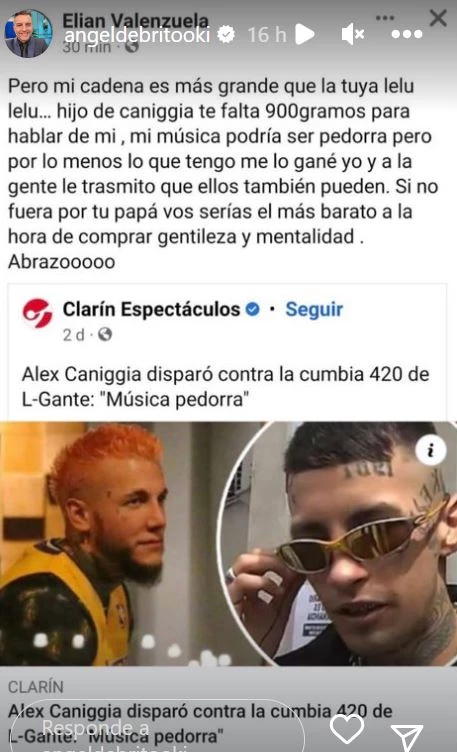 L-Gante replicó en Facebook una nota que aludía a la crítica de El Emperador y lo cruzó. “Pero mi cadena es más grande que la tuya, lelu lelu... Hijo de Caniggia, te faltan 900 gramos para hablar de mí... “, arrancó.