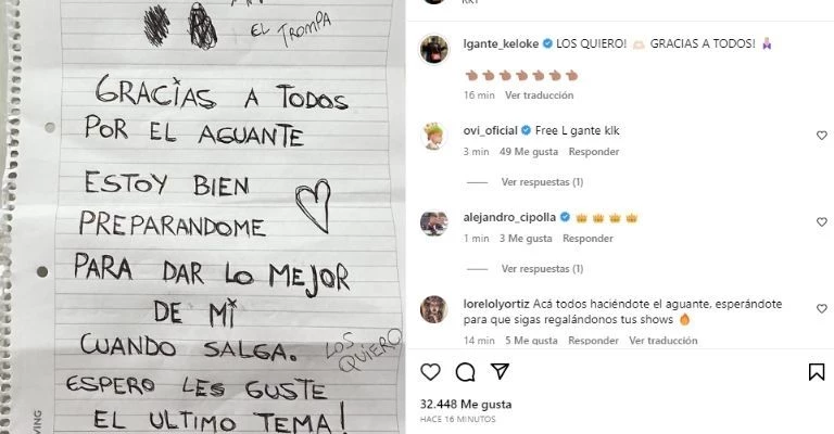 En el primer mensaje que mandó, L-Gante reveló: "Gracias a todos por el aguante. Estoy bien, preparándome para dar lo mejor de mí cuando salga. Espero que les guste el último tema. Se viene mucho más. Los quiero. Si no salgo ganando, prefiero no salir".