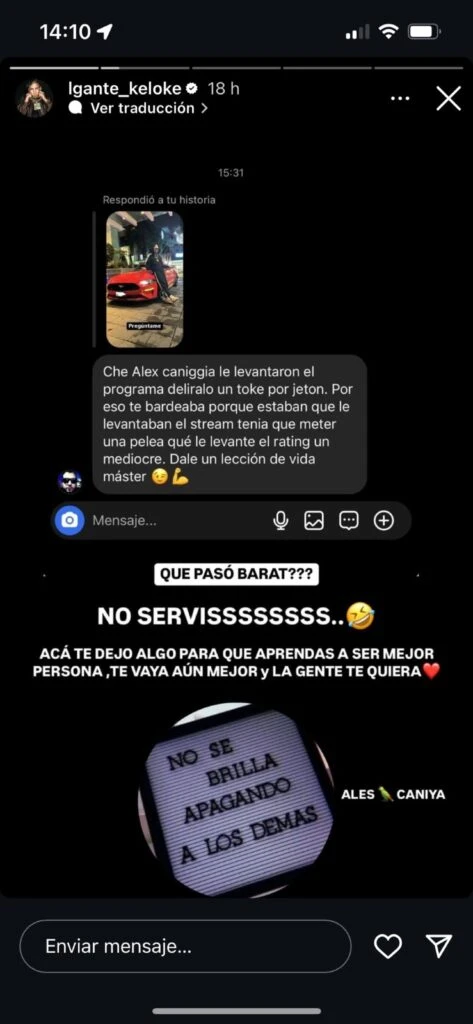 “Che, le levantaron el programa. Deliralo un toque por jetón. Por eso te bardeaba, porque estaba a punto de ser levantado, tenía que pelear. Dale lección de vida máster", fue el mensaje de un fan del cantante. A lo que, sobre dicha imagen, L- Gante escribió: "¿Qué pasó barat?”.