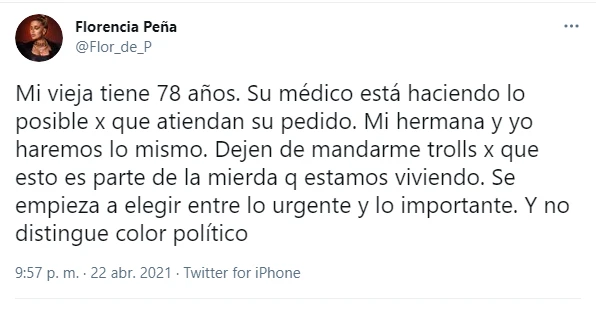 Enojada por la catarata de tuits que le llegaron, Flor se explayó sobre la situación que está viviendo y apuntó a los haters: "Mi vieja tiene 78 años. Su médico está haciendo lo posible x que atiendan su pedido. Mi hermana y yo haremos lo mismo. Dejen de mandarme trolls x que esto es parte de la mierda q estamos viviendo. Se empieza a elegir entre lo urgente y lo importante. Y no distingue color político", aclaró.