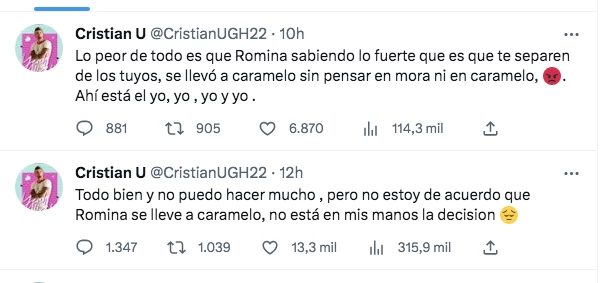 Cristian U, defensor de los derechos caninos y amante absoluto de los cuatro patas, manifestó su bronca en redes sociales, luego de que Romina se alzó con el cachorro y lo sacó de la casa. "Todo bien y no puedo hacer mucho. Pero no estoy de acuerdo que Romina se lleve a Caramelo. No está en mis manos la decisión", expresó el ex ganador de Gran Hermano.