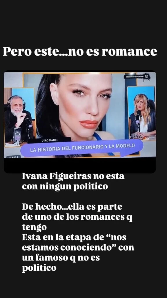Pero poco después, la panelista decidió dar una pista concreta sobre uno de esos romances. Subió una nueva historia con una gran foto de Ivana Figueiras, acompañada del texto: “Pero este... no es romance”. Lejos de desmentir la información, agregó: “Ivana Figueiras no está con ningún político. De hecho, ella es parte de uno de los romances que tengo”.