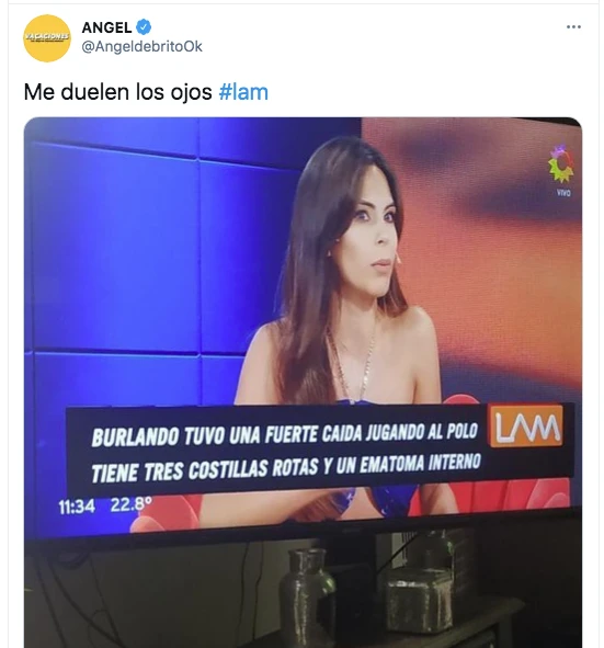 Ángel se percató de un horror ortográfico y decidió “denunciarlo” en Twitter. “Me duelen los ojos”, escribió el comunicador, con una foto de la captura de ese preciso instante, en el que salió al aire la gráfica que rezaba: “Burlando tuvo una fuerte caída jugando al polo. Tiene tres costillas rotas y un ematoma interno”.