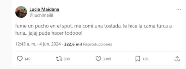 La morocha saltó al universo de Twitter para expresarse libremente y con mucha naturalidad enumeró las acciones que realizó en esos minutos en la casa, así se pudo confirmar que pergeñó una broma contra Scaglione. “Fumé un pucho en el spot, me comí una tostada y le hice la cama turca a Furia, jajaja. Pude hacer todo”, admitió.
