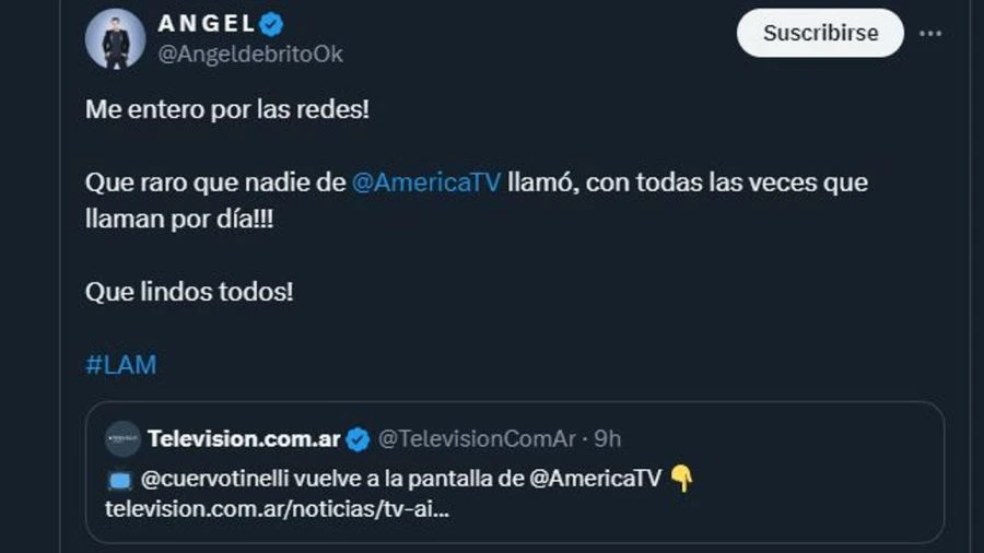 Indignado, Ángel de Brito decidió expresarse en sus redes sociales tras enterarse que su programa tendrá menos tiempo al aire: "¡Me entero por las redes! ¡Que raro que nadie de @AmericaTV llamó, con todas las veces que llaman por día! ¡Que lindos todos!".