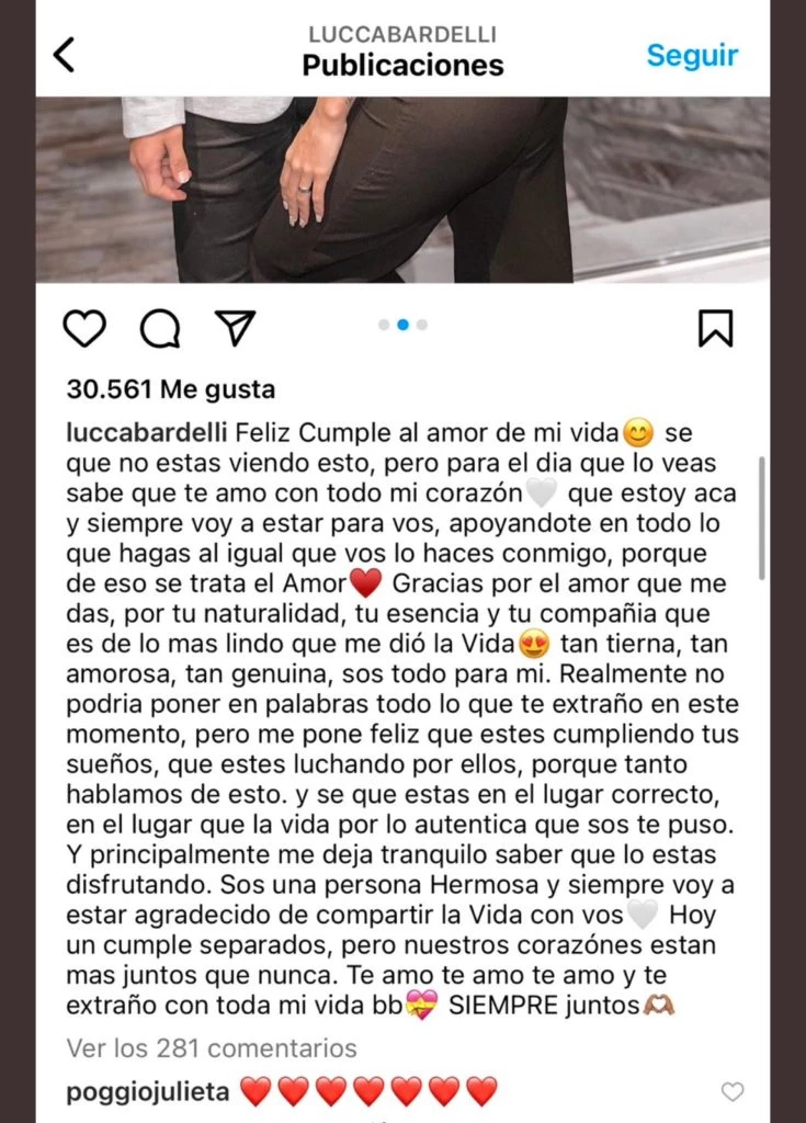 Finalmente, volvió a confesar que la espera al final del reality: “Y principalmente me deja tranquilo saber que lo estas disfrutando. Sos una persona Hermosa y siempre voy a estar agradecido de compartir la Vida con vos Hoy un cumple separados, pero nuestros corazónes estan mas juntos que nunca. Te amo te amo te amo y te extraño con toda mi vida bb SIEMPRE juntos”.