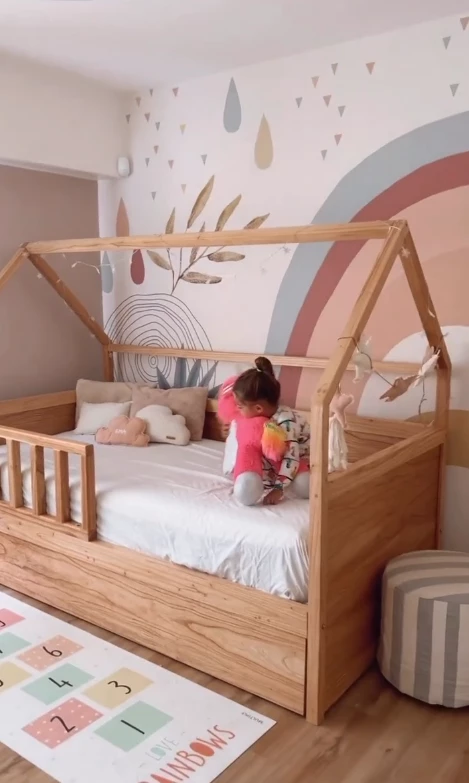 Maderas claras, mucho blanco, alfombras peludas y el típico cuadro que reza “Vive, ríe, ama” están presentes en el hogar de la actriz, a quien le encanta ocuparse personalmente de los detalles de su hogar, tal como lo demostró en pandemia, al pintar por su cuenta el cuarto de su hija.