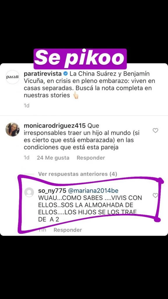Cuando salieron a la luz los rumores de crisis entre Vicuña y la China en pleno embarazo, @so_ny775 cruzó con dureza a una usuaria que la criticó por quedar embarazada en medio de una crisis con su pareja. "Wuau, cómo sabés? Vivís con ellos? Sos la almohada de ellos? A los hijos se los trae de a dos", le respondió.