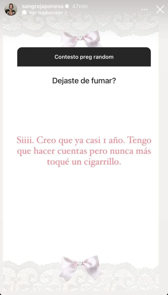 En la app de la red de la camarita, la actriz eligió compartir la consulta de un seguidor que le escribió: “¿Dejaste de fumar?”. A lo que la ex de Benjamín Vicuña respondió: “Siii. Creo que ya casi un año. Tengo que hacer cuentas pero nunca más toque un cigarrillo”.