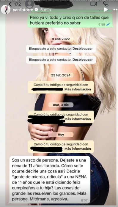 “Sos un asco de persona. Dejaste a una nena de 11 años llorando. Cómo se te ocurre decirle una cosa así. Decile ‘gente de mierda’, ‘ridícula’, a una NENA de años que le está diciendo ‘feliz cumpleaños a tu hija’. Las cosas de los grandes se resuelven con los grandes. Mala persona, mitómana, agresiva”, sentenció la China.