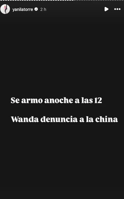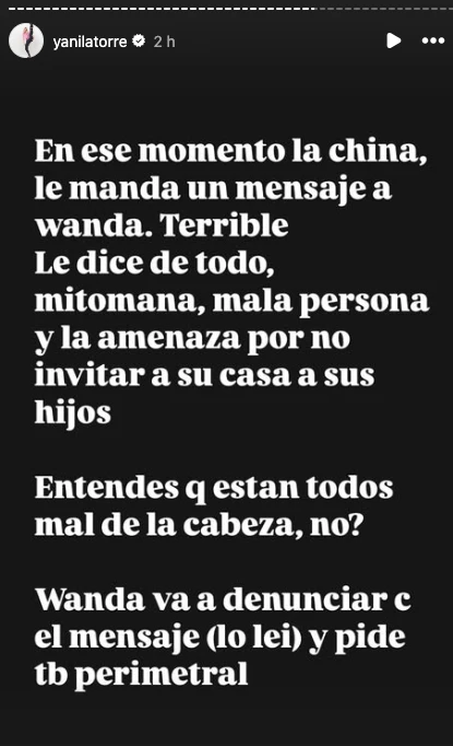 “En ese momento la China le manda un mensaje a Wanda. Terrible. Le dice de todo, ‘mitomana’, ‘mala persona’, y la amenaza por no invitar a su casa a sus hijos. Wanda va a denunciar con el mensaje y pide también perimetral”, expuso Yanina.